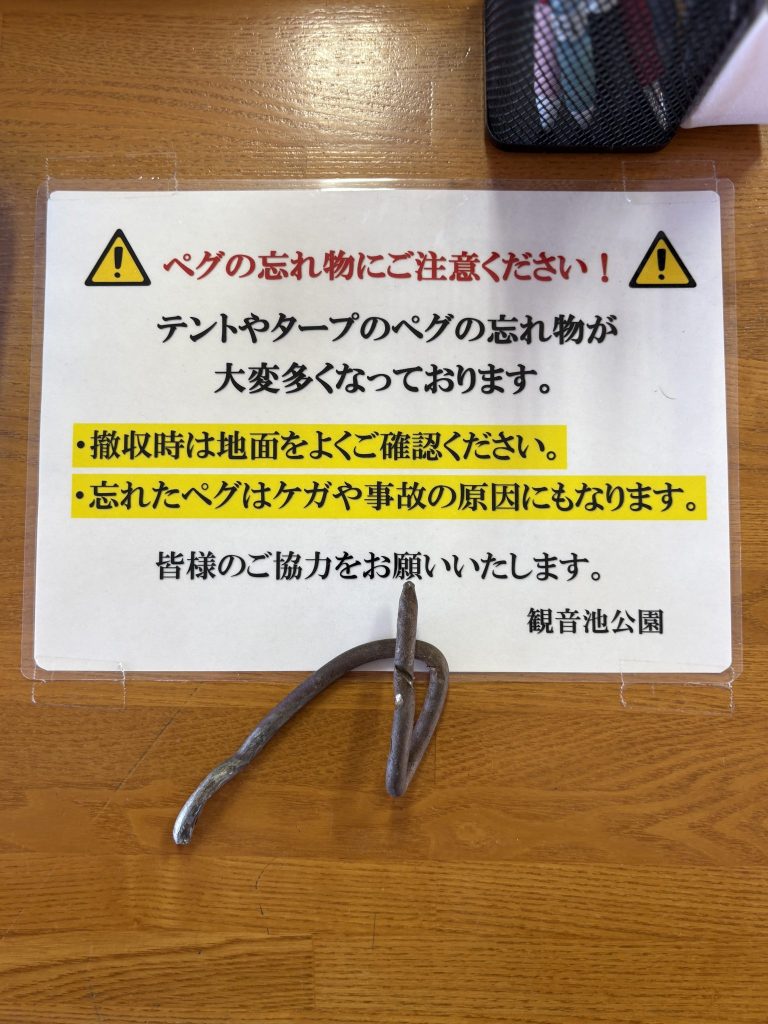 キャンプシーズンとなり、特にこの時期は週末を中心にたくさんの方にキャンプ場をご利用いただいておりますが、このところテントやタープのペグの抜き忘れ・置き忘れが大変多くなっております