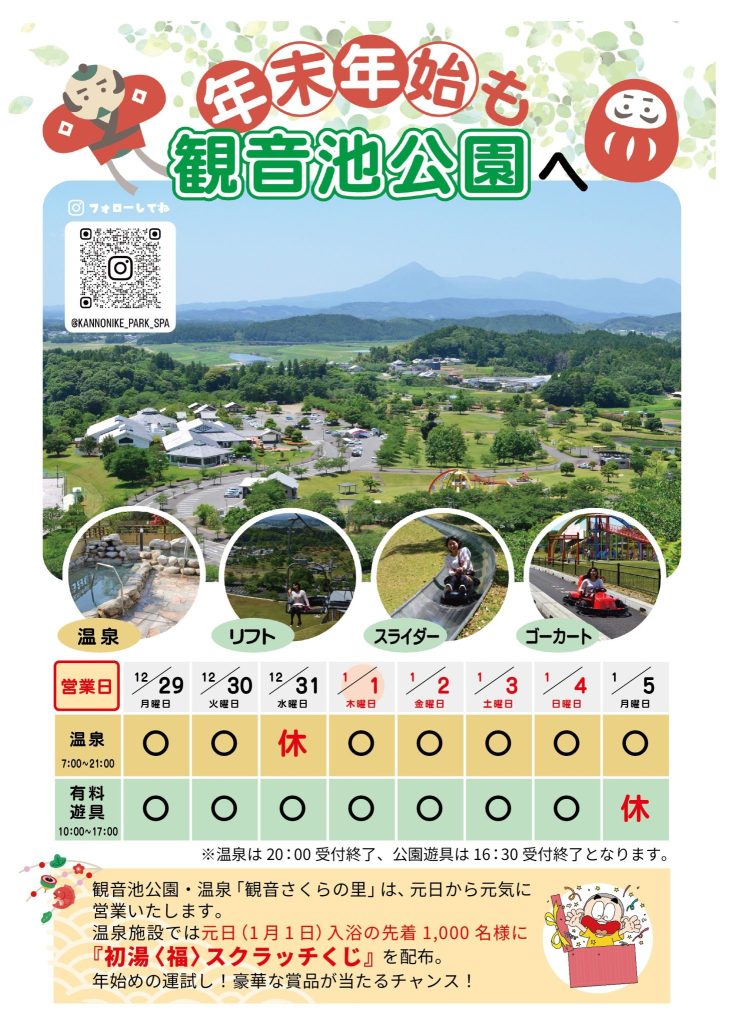 都城ぼんち地域振興 観音さくらの里 観音池公園 2025.12.25 配信 年末年始 営業のお知らせ 【年末年始の営業のお知らせ】 ■温泉施設「観音さくらの里」 12月31日(水)は定休日のため休業いたします。 ◎1月1日入浴のお客様先着1,000名様に「初湯〈福〉スクラッチくじ」を配布、空くじなしのスクラッチ抽選会を開催いたします。年始めの運試し!豪華な賞品が当たるチャンス! ■観音池公園 有料遊具営業 12月27日(土)~1月4日(日)は毎日、有料遊具を営業いたします。 ※雨天休業の場合あり、1月5日(月)以降は土日祝日の営業となります。 前のページに戻る