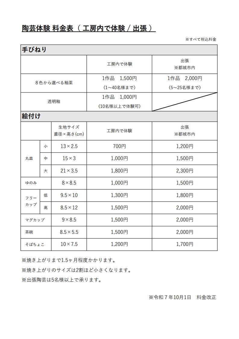 | 日曜体験 | 13:00~毎週日曜日は楽しめる陶芸教室を開催しています。 |